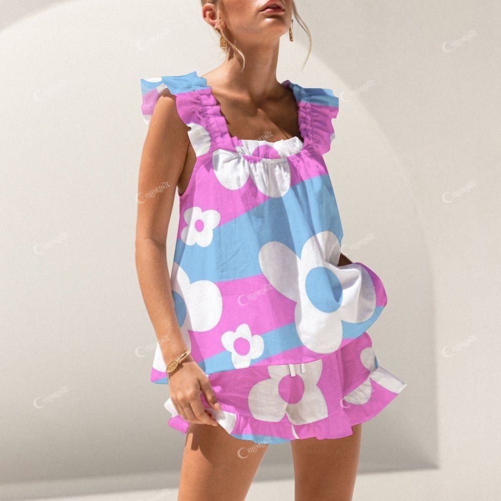 Colordate Pink And Blue Patchwork And Floral Prints Short Tank Top Shorts Pajama Set