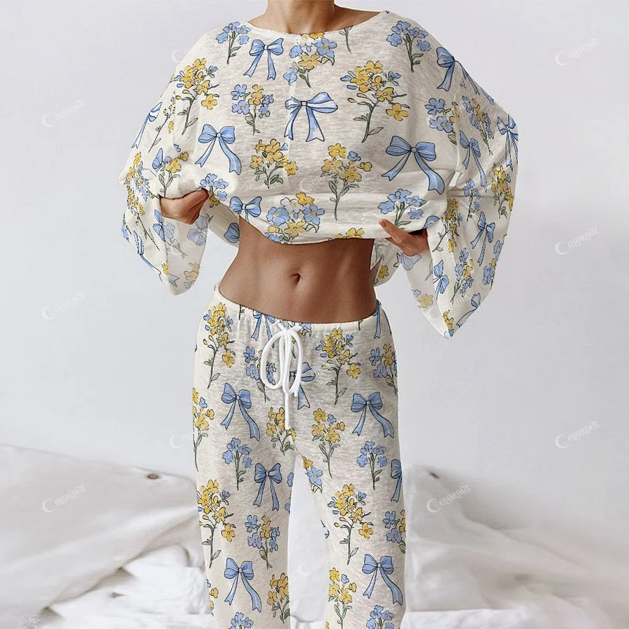 Colordate Women's Blue Bow And Yellow Flower Print Long Sleeve Cotton Homewear Set