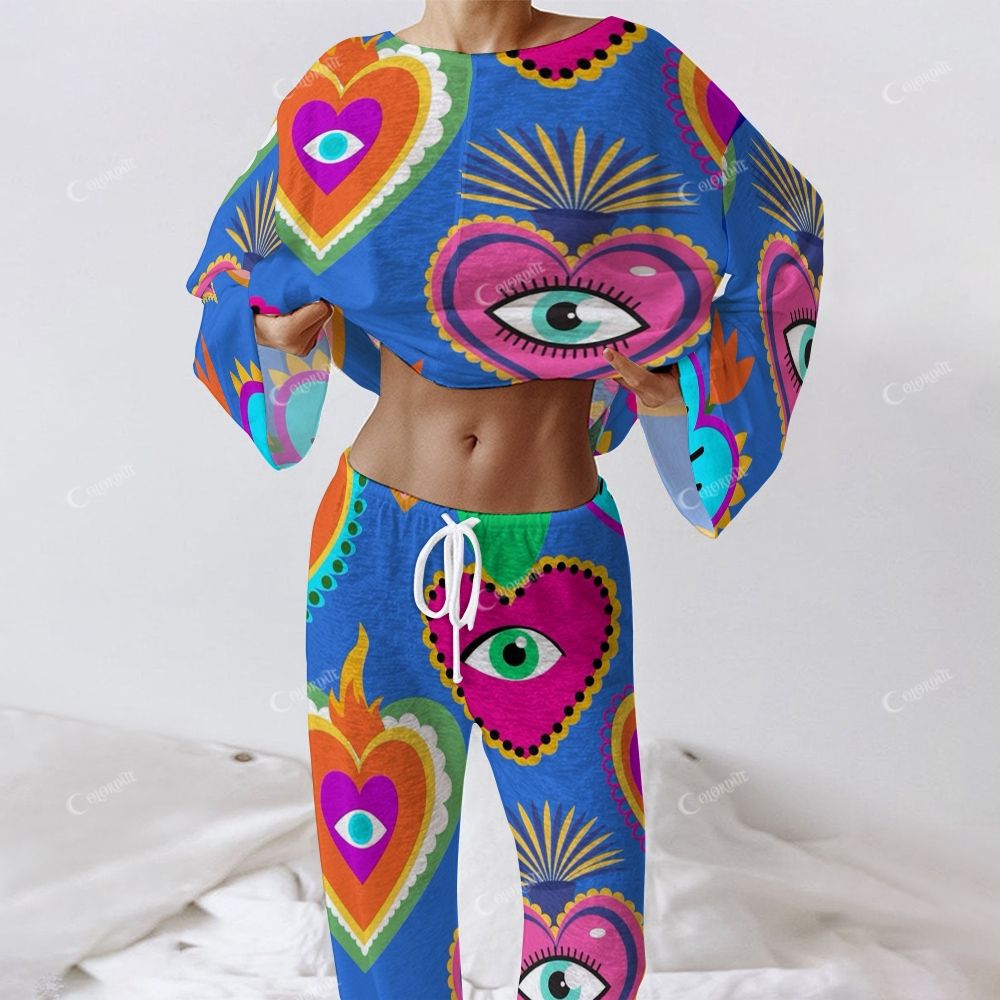 Dive into a dreamscape of tender devotion with "Ocean of Love", where hypnotic eyes and romantic motifs float across the softest cotton canvas like secrets whispered at midnight. Bathed in soothing shades of blue, this enchanting set wraps you in a visual sonnet—part love letter, part mystical talisman. The lightweight top around your shoulders like sea mist, while the relaxed pants billow with every step, creating poetry in motion. Whether curled up with a novel or dancing barefoot to old records, this is loungewear for souls who believe in love's quiet magic.