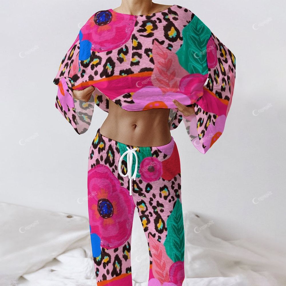 Colordate Women's Floral And Leopard Print Long Sleeve Cotton Homewear Set