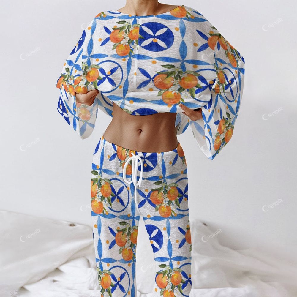 Colordate Women's Fruits And Geometric Prints Long Sleeve Cotton Homewear Set