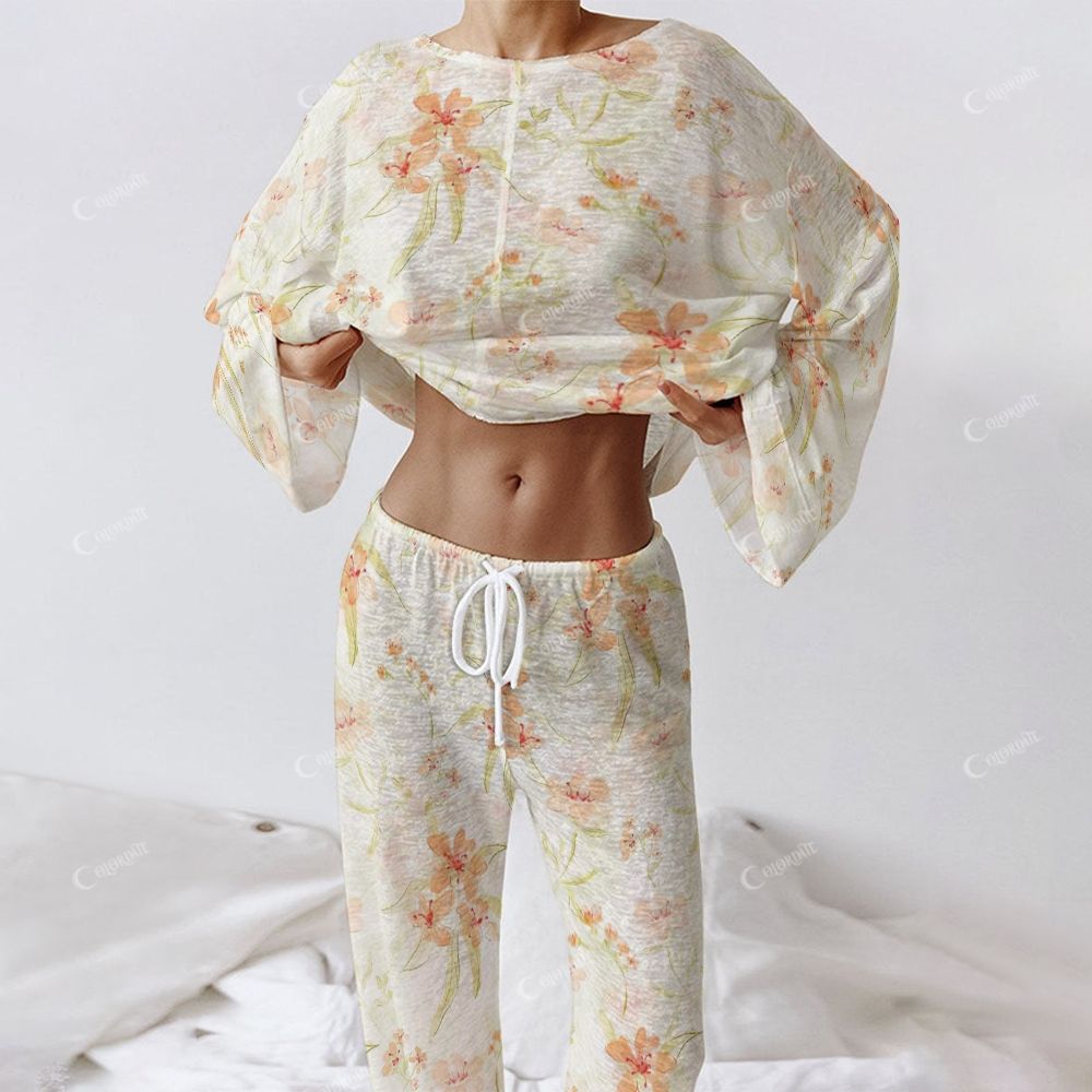Step into a sun-drenched garden where orange petals swirl with tropical leaves in a vibrant midsummer waltz. This captivating pajama set paints an exotic paradise across buttery-soft fabric, with bold orange blossoms that seem to glow with their own golden-hour radiance. The soft top and flowing pants feature an artistically arranged bouquet that transitions from delicate buds to full blooms, as if capturing a flower's entire life cycle in one magical print.