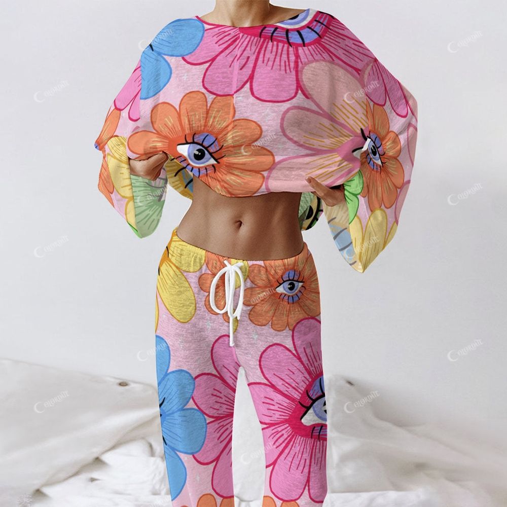 Each eye-embellished blossom winks with quiet mischief, their lashes brushing against oversized poppies and dahlia in hues of melted sherbet and electric pastels. The intentional crinkle texture adds dimension like well-loved parchment, inviting you to unravel its stories as you nestle into bed. Unlike stiff sleepwear, this set moves with you—the featherweight fabric breathing like living skin, keeping you cool even when dreams run wild.