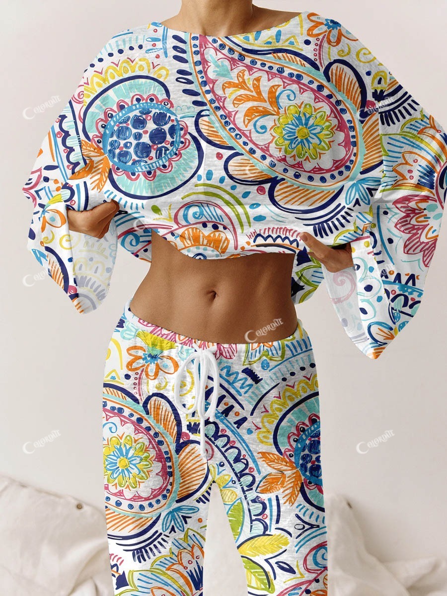 Women's Bohemian Art Print Long Sleeve Pajama Set