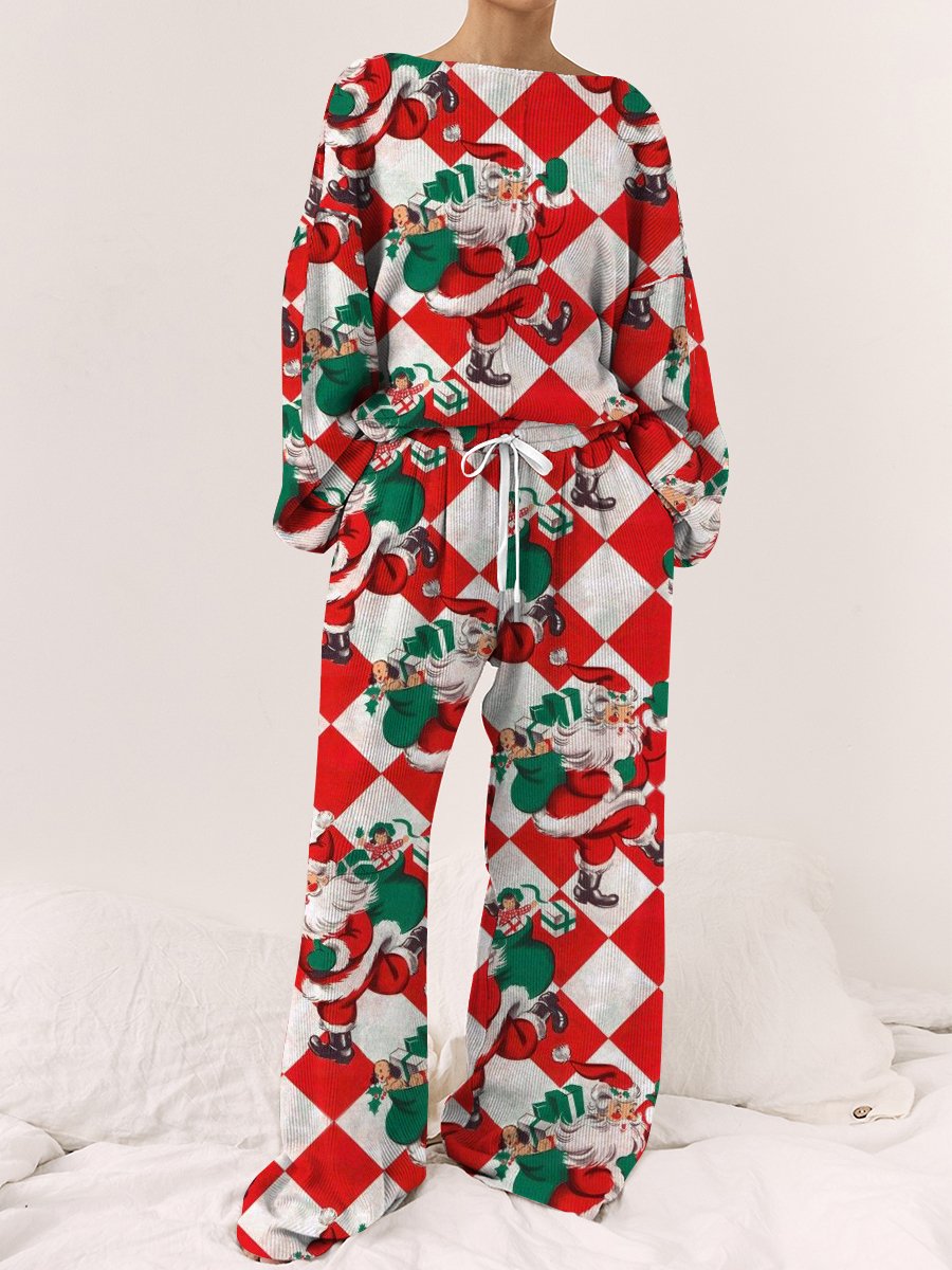 Women's Christmas Checkerboard Santa Claus Long Sleeve Pants Suit
