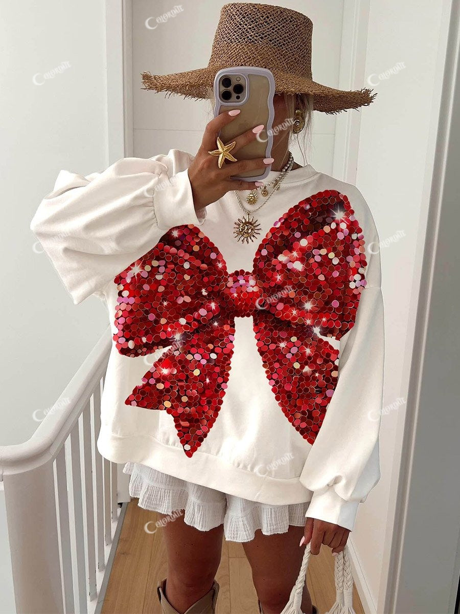 Description: Step into the spotlight with our Sparkling Red Bow Sweatshirt, where everyday comfort meets show-stopping elegance. Like a gift wrapped in stardust, this eye-catching top transforms simple moments into celebrations with its radiant charm and irresistible sparkle.